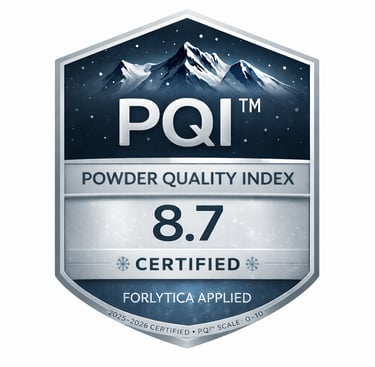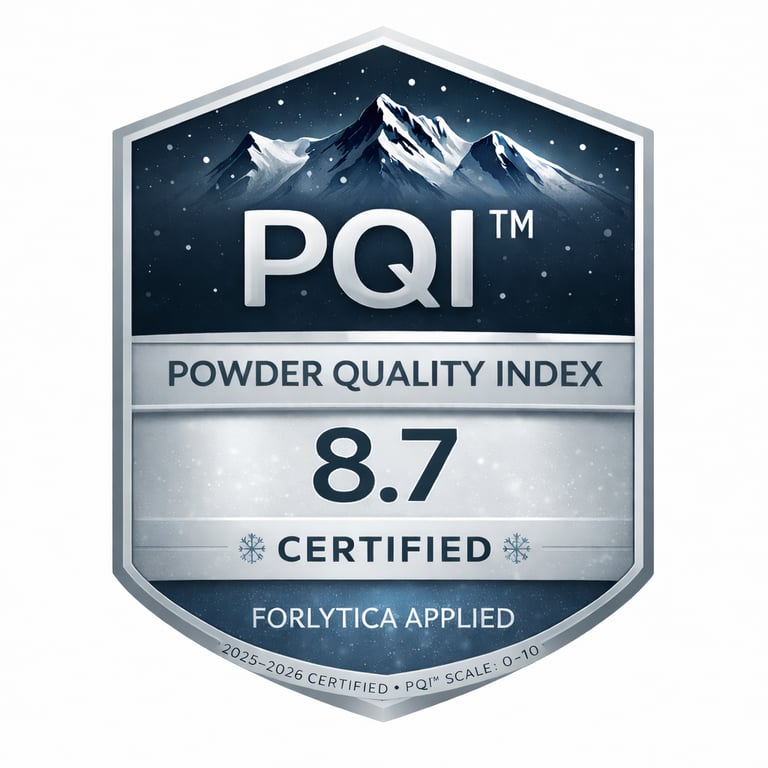 • Powder Quality Index (PQI™) values—typically observed in the [PQI: X.X–X.X] range—reflecting low-density snowfall, strong structural persistence, and slower post-storm degradation.